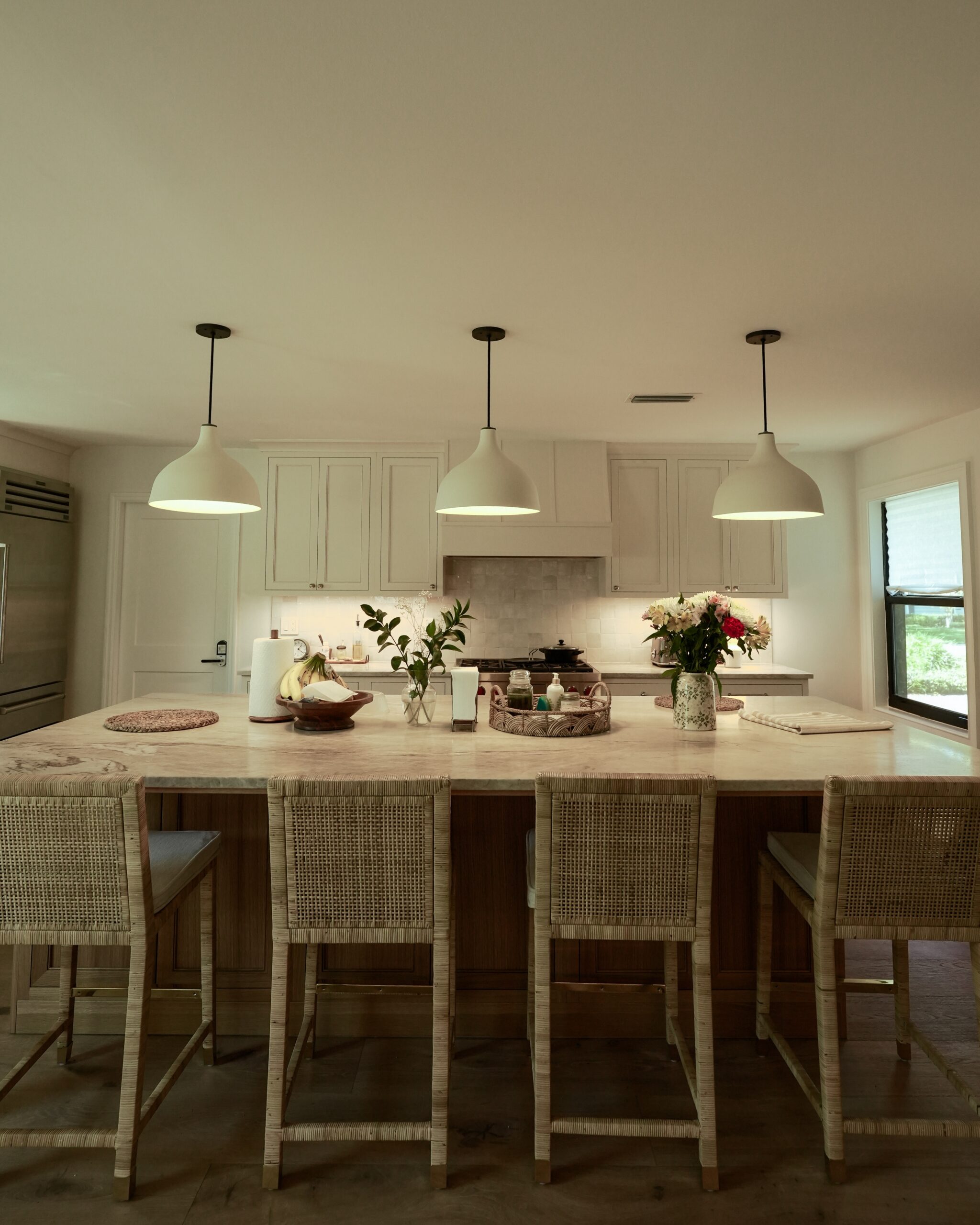 Integrated refrigerator and dishwasher panels installed flush and factory-tight, so every appliance disappears into the design.